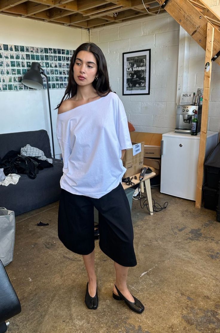 Perpaduan styling ini cocok untuk cosmo babes yang ingin membawa kombinasi t-shirt dan kulot klasik mereka ke level yang lebih elevated. One-shoulder top dengan potongan asimetris menghadirkan sentuhan yang tepat, tidak berlebihan, namun tetap memberikan sentuhan playful. Lengkapi tampilan dengan strappy heels yang ramping untuk sentuhan feminin yang memperpanjang garis kaki secara visual.