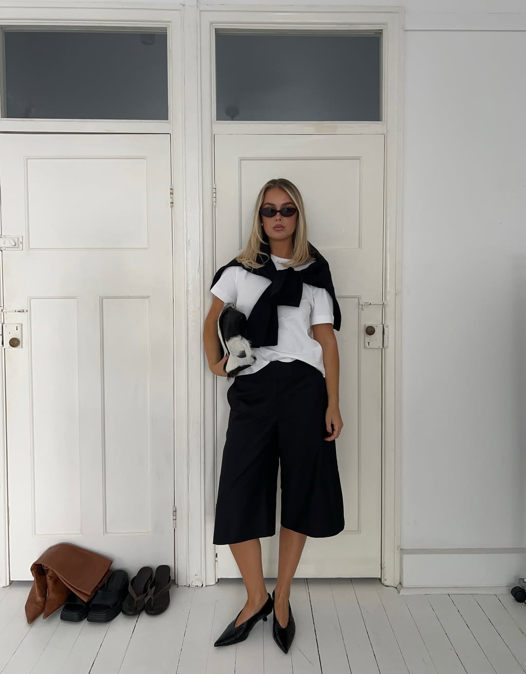 Siapa bilang kulot tidak bisa tampil kasual? Kombinasi klasik ini membuktikan sebaliknya dengan cara yang paling menyenangkan. Mulailah dengan T-shirt polos yang clean; putih atau hitam selalu jadi pilihan yang aman, lalu padukan dengan kulot favoritmu. Kemudian, ikatkan sweater tipis atau knit di atas bahumu dengan santai untuk sentuhan preppy yang terasa sangat off-duty. Trik sederhana ini secara instan menambahkan dimensi dan tekstur pada outfitmu tanpa usaha yang berlebihan. Pilih sneakers atau loafers untuk melengkapi tampilan, dan Cosmo babes sudah siap menjalani hari dengan gaya yang terasa simple but chic.