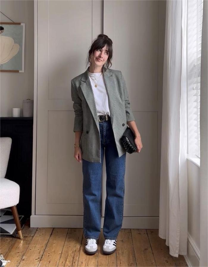 Ini adalah kombinasi paling aman dan nggak pernah gagal. Kalau kamu baru mau mencoba memakai blazer untuk acara santai, mulailah dari mix and match ini.