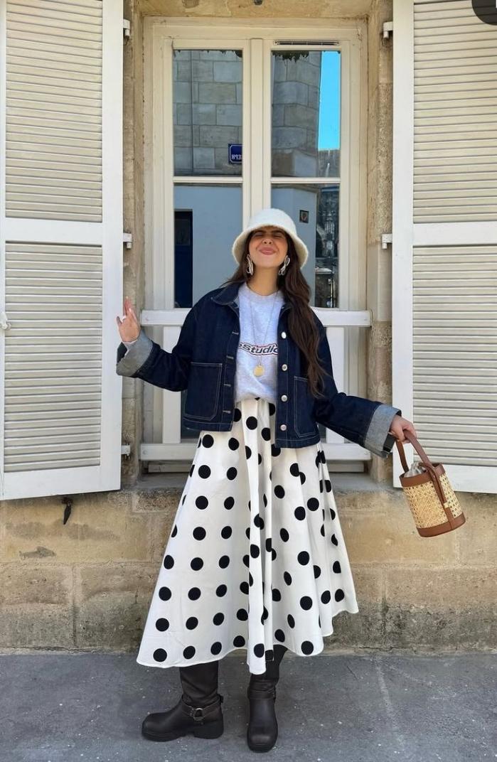 Salah satu tips styling motif polkadot agar tidak terlihat terlalu formal adalah dengan memadukannya dengan bahan denim. Denim punya kekuatan ajaib untuk membuat outfit apa pun terlihat lebih santai dan effortless.