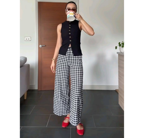 Busana ini dengan sempurna menangkap interpretasi ceria dan grafis dari gaya chic gadis Prancis klasik. Busana ini menampilkan celana panjang berpinggang tinggi dan lebar dengan motif gingham hitam-putih yang berani, yang langsung menciptakan suasana retro yang menyenangkan.