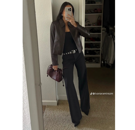 Untuk menambah tekstur dan struktur, jaket bomber kulit berwarna cokelat tua yang kaya ditambahkan di atasnya. Aksesori yang benar-benar menonjol dan menjadi penyeimbang seluruh penampilan adalah ikat pinggang bergaya Barat bertabur hiasan perak yang memberikan sentuhan tak terduga yang sangat penting. Terakhir, tas burgundy kecil yang menambahkan sentuhan warna yang halus dan tekstur lembut yang kontras pada keseluruhan tampilan. Pakaian stylish ini memberikan kesan yang rapi untuk akhir pekan, menjadikannya ideal untuk digunakan pada malam hari.