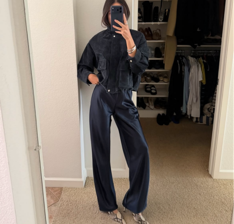Tampilan ini menghadirkan potongan yang santai dan sentuhan klasik. Jaket hitam pendek, sedikit terstruktur tetapi tetap nyaman, yang mudah dipadukan dengan celana panjang lebar yang mengalir dan berkilau lembut. Proporsinya berperan penting di sini–pendek di atas, memanjang di bawah, sehingga menciptakan siluet yang terasa modern dan disengaja tanpa terkesan berlebihan.