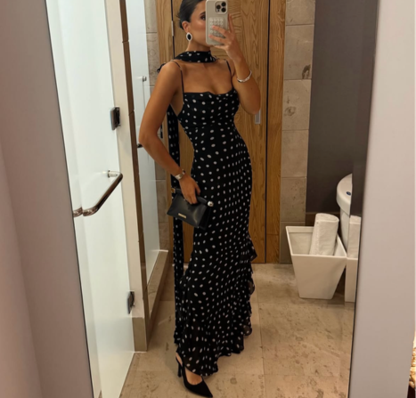Tampilan ini mengedepankan kemewahan malam yang elegan dengan sentuhan yang menyenangkan. Gaun hitam bermotif polkadot yang pas di tubuh sebelum jatuh ke bagian bawah yang sedikit melebar, memberikan siluet garis yang panjang dan elegan. Garis leher yang terinspirasi dari model halter dan detail seperti syal di leher menambahkan sentuhan modern yang sedikit dramatis, sementara motif titik klasik mencegahnya terasa terlalu serius.
