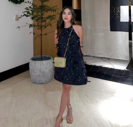 Tampilan ini akan menarik semua perhatian kepada Babes. Sebuah mahakarya yang menampilkan garis leher halter ramping dan deretan pita mini yang dihiasi mutiara berkilauan. Hasilnya adalah efek tiga dimensi yang terasa unik dan tertata dengan sempurna.