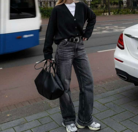 Ansambel ini adalah paduan sempurna dari busana santai dengan rona hitam. Paduan atasan rajut yang lembut dengan denim yang kasar membuat tampilannya begitu unik. Kardigan hitam berkerah V yang longgar dipadukan dengan kaos putih bersih, memberikan titik fokus kontras tinggi yang langsung mencerahkan penampilan. Sementara, celana jeans berpinggang tinggi berwarna abu-abu gelap dengan potongan lebar menonjolkan tren kekinian.