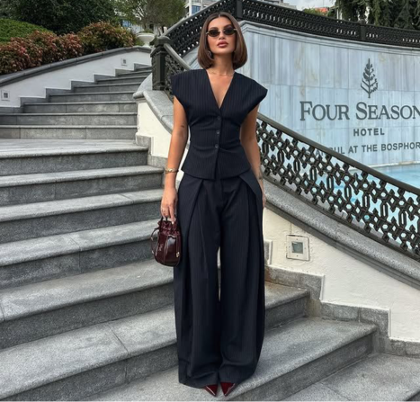 Atasan yang terstruktur ini diimbangi dengan celana panjang ekstra lebar yang serasi, yang mengalir elegan saat bergerak. Untuk melengkapi gaya satu ini, tas mewah mengilap dan sepatu hak tinggi runcing yang serasi, menambahkan sentuhan warna yang modern pada palet gelap.