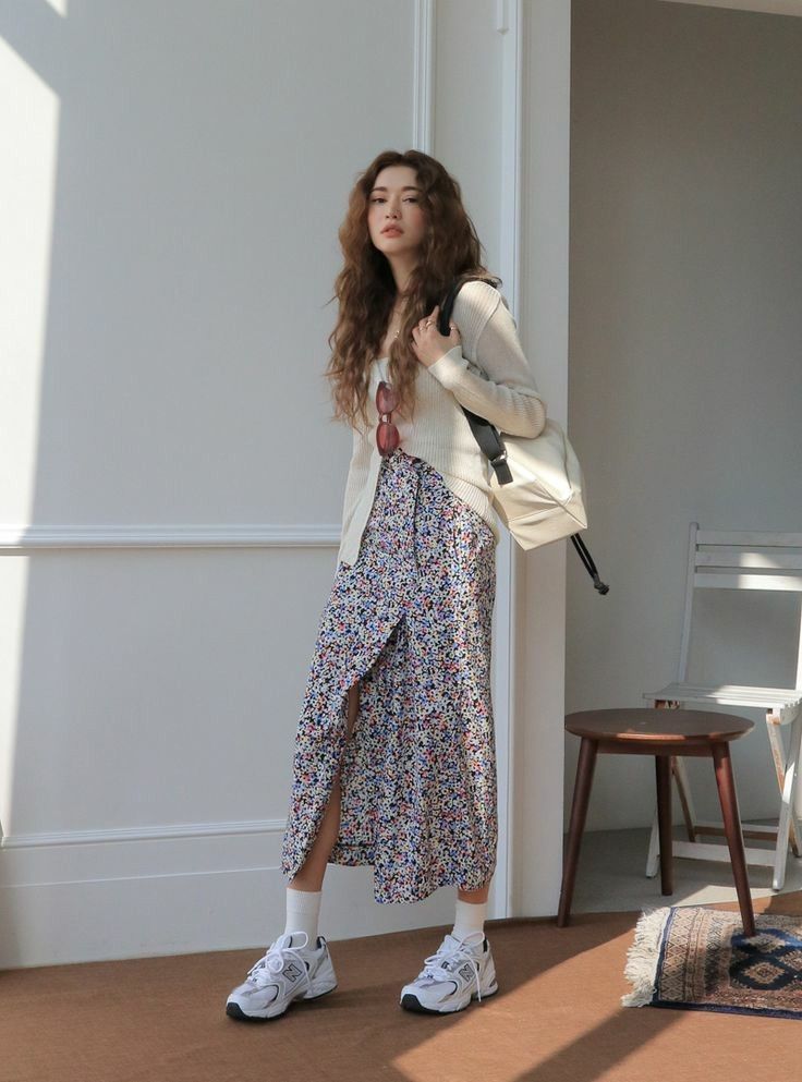 Pilih satin slip skirt atau maxi skirt dengan motif floral yang feminin. Padukan dengan graphic tee yang diikat di pinggang (atau dimasukkan ke dalam) dan chunky sneakers warna pastel.