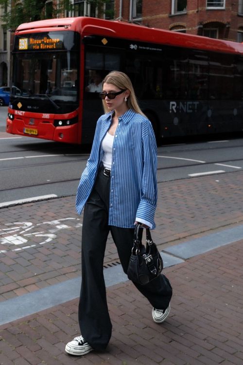 Siluet sneaker yang besar akan menyeimbangkan volume blazer di bagian atas. Ini adalah gaya kasual yang sangat populer karena terlihat profesional tapi tetap santai.