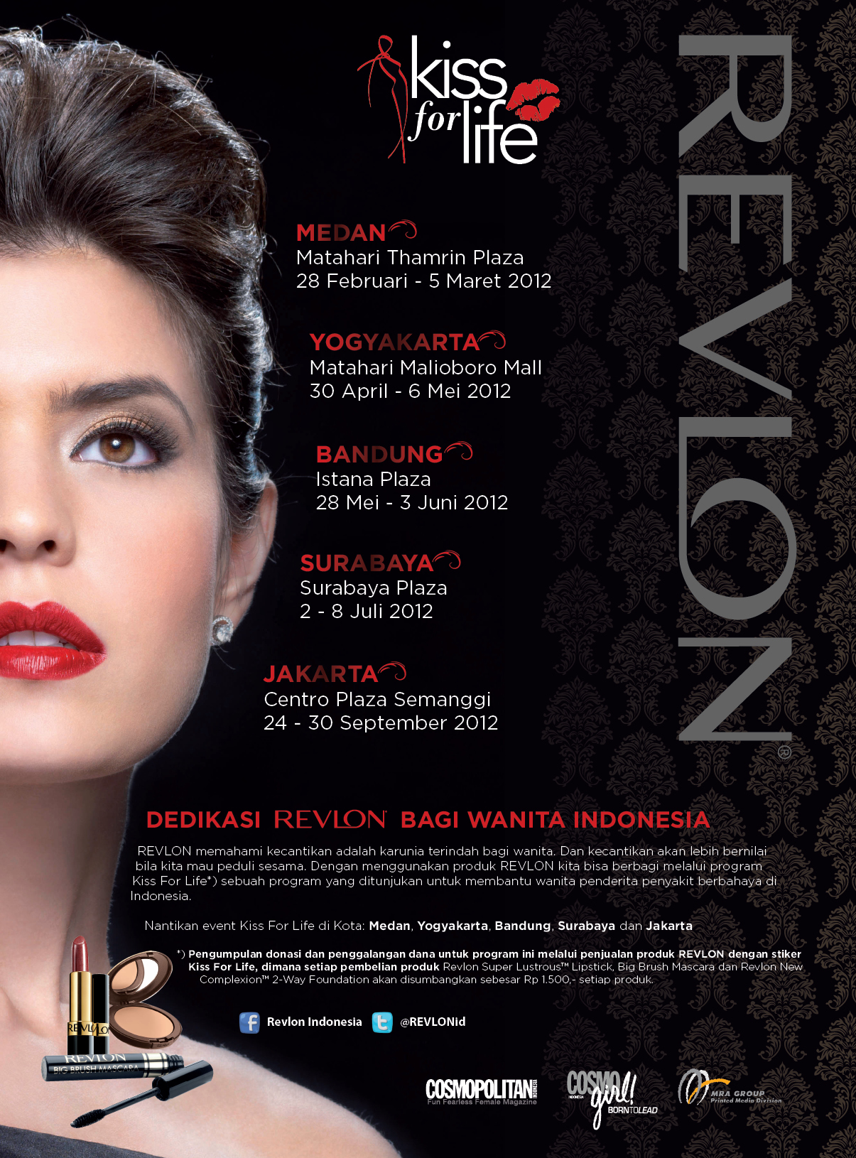 Revlon memahami kecantikan adalah karunia terindah bagi wanita. Dan kecantikan akan lebih bernilai bila kita mau peduli sesama. Dengan menggunakan produk Revlon kita bisa berbagi melalui program Kiss for Life*), sebuah program yang ditujukan untuk membantu wanita penderita penyakit berbahaya di Indonesia.