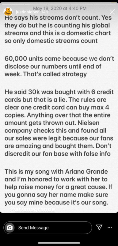 Justin kemudian mengunggah Instagram Story untuk membela posisi lagunya dengan berkata, “60.000 unit muncul karena kami tidak menutup angka hingga pekan berakhir. Itulah yang dinamakan strategi.” Ia juga membela Ariana dengan bilang, “Jika kamu akan menyebut namanya [Ariana], pastikan juga kamu menyebut nama saya karena itu adalah lagu kami [berdua].”