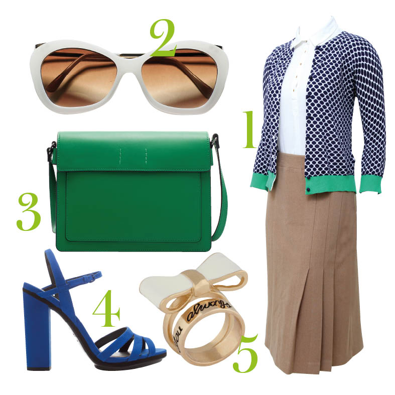 Rok midi yang dipadukan bersama sleeveless top dan cardigan bercorak dapat menyulap keseluruhan outfit terlihat prima. Rona cerah pada aksesori pun dapat meningkatkan mood bekerja Anda secara instan. Look fresh the entire day! (Nia / DA / TA / Image: Dok. Cosmopolitan)