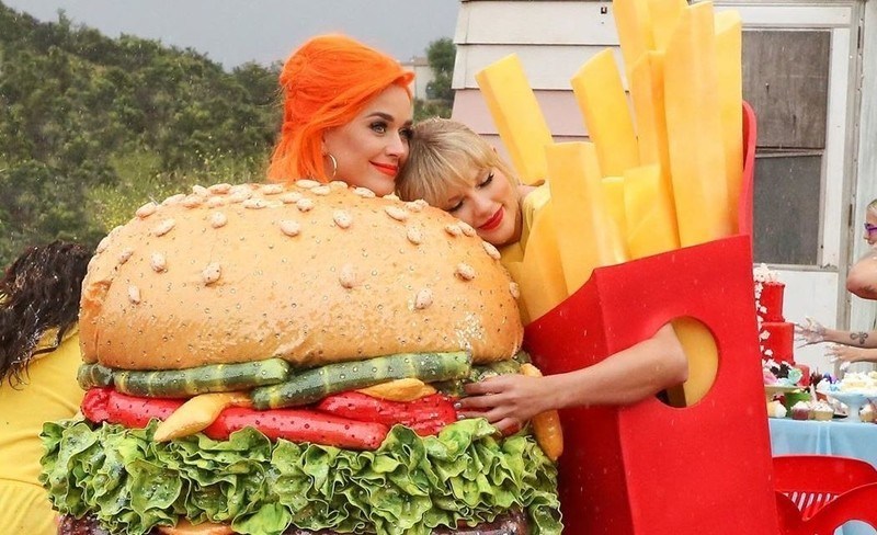 6. Surprise, surprise! Katy Perry dan Taylor sudah tidak lagi bermusuhan - setelah mengkonfirmasi hubungan baik mereka di Instagram, Katy tampil dengan kostum hamburger yang ia pakai di Met Gala dan berpelukan dengan Tay yang mengenakan kostum kentang goreng. Awww.