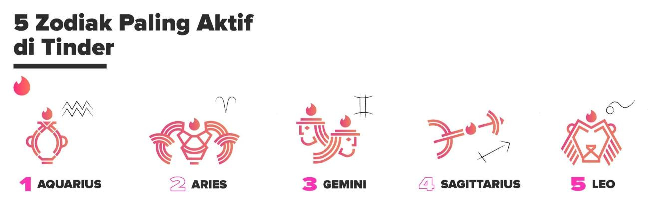 Menurut riset yang dilakukan oleh Tinder Indonesia, Aquarius, Aries, Gemini, Sagitarius, dan Leo dikenal sebagai lima zodiak paling aktif di Tinder, dilihat dari frekuensi mereka melakukan swipe.