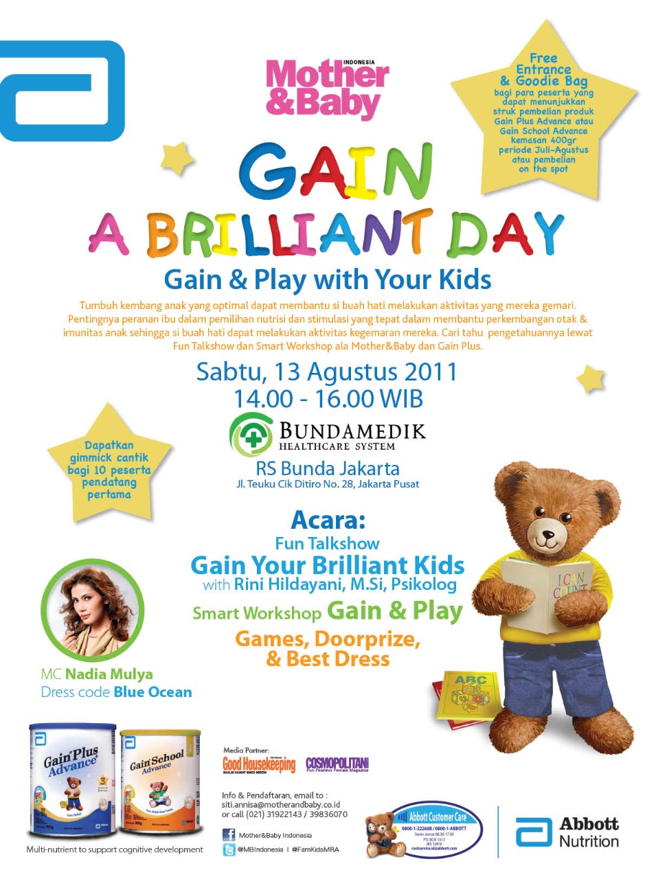 Tumbuh kembang anak yang optimal dapat membantu si buah hati melakukan aktivitas yang mereka gemari. Pentingnya peranan ibu dalam pemilihan nutrisi dan stimulasi yang tepat dalam membantu perkembangan otak & imunitas anak sehingga si buah hati dapat melakukan aktivitas kegemaran mereka. Cari tahu pengetahuannya lewat Fun Talkshow dan Smart Workshop ala Mother&Baby dan Gain Plus.