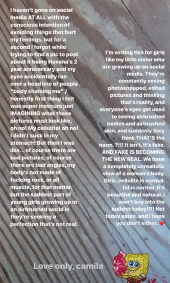 Intinya adalah – menurut Camila – semua orang tentunya memiliki foto dan angle yang “buruk”, dan sebenarnya dari segi apa orang-orang bisa menilai foto yang kamu unggah adalah “buruk”? Seperti yang Camila katakan, “Bagian paling sedih adalah gadis-gadis yang tumbuh di dunia yang penuh modifikasi dan terus mencari kesempurnaan yang tak pernah ada.”