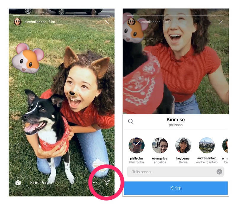 Berbagi Stories melalui Direct semudah berbagi postingan foto dari feed Anda. Saat Anda ingin berbagi stories, tekan ikon Direct yang ada di pojok kanan bawah, pilih teman atau grup yang akan melihat stories tersebut dan tekan kirim.