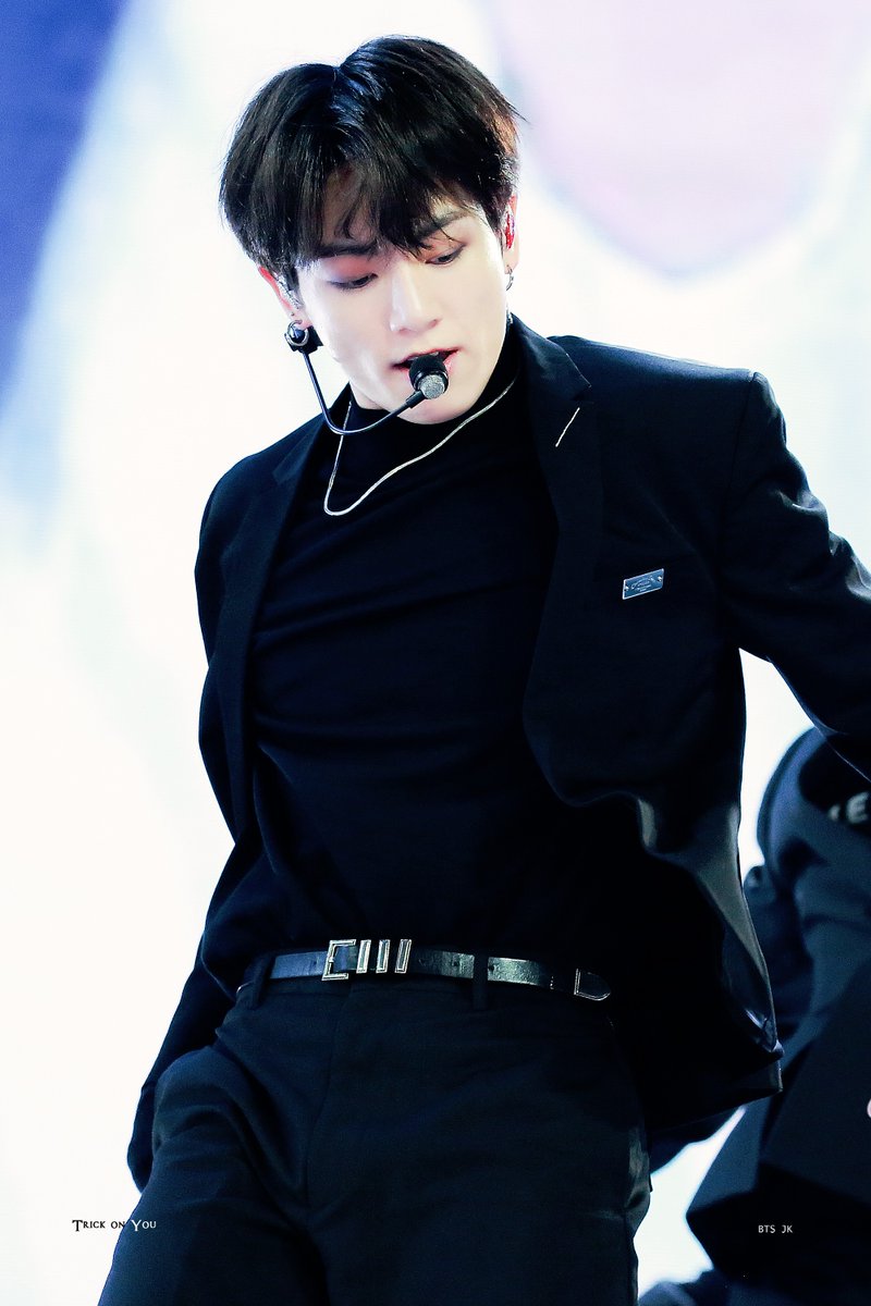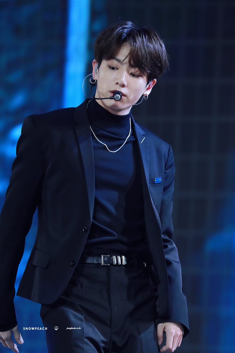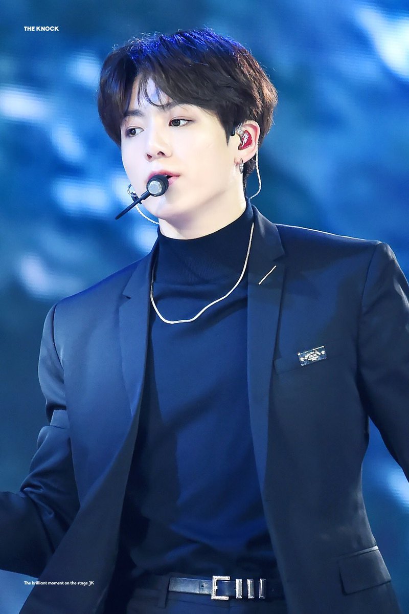 Calling all Jungkook stans! Bagi kamu yang menyukai tampilan Jungkook dengan warna-warna gelap seperti hitam maka jangan sampai melewatkan betapa tampannya ia dalam balutan black suit berikut ini. Dalaman semi turtleneck yang melekat sempurna di tubuh proporsional Jungkook tersebut juga menjadi scene stealer tersendiri dari penampilan JK. Warna hitam jelas tak hanya menghidupkan kesan seksi dan misterius, tetapi juga sungguh begitu kontras dan menyatu dengan warna kulit Jungkook.