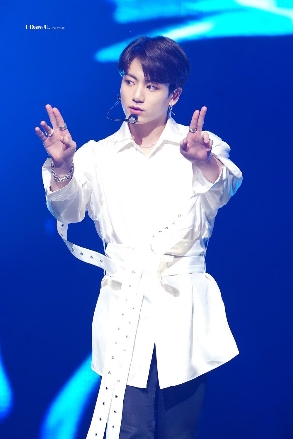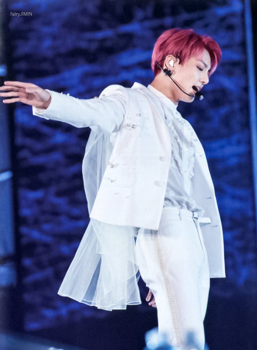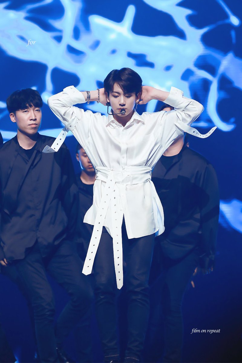 We never get enough with Jungkook and his white shirt! Kali ini outfit terbaik Jungkook datang dari kemeja dengan aksentuasi pita di area pinggang dan lengannya. Hal terbaik dari outfit berwarna putih yang dipakai Jungkook ini tentu saja bagaimana kostumnya yang berhasil memperlihatkan area pinggang slim dan lean milik Jungkook.