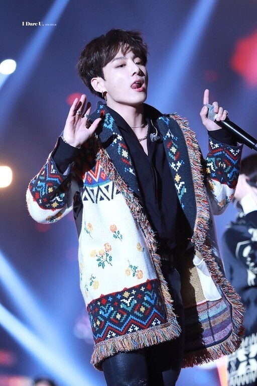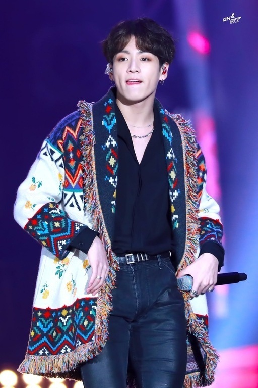One of the best outfit for Jungkook BTS is here! Di event SBS Gayo Daejeon 2018 silam Jungkook bersama BTS hadir dengan menggunakan outer panjang bermotif bohemian yang sangat berbeda dari outfit-outfit BTS yang pernah ada. Meski memakai motif bohemian ini kesan modern dan versatile tetap terasa dari tampilan Jungkook, sebab pria berzodiak Virgo ini memasangkannya dengan kemeja berpotongan V neck (yang super seksi) dan celana hitam ketat! Save it!