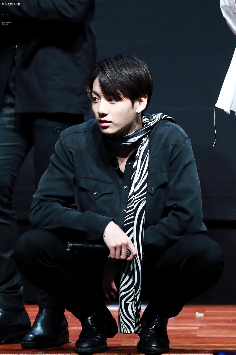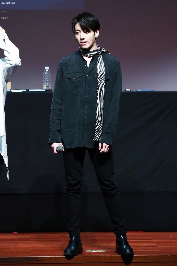 Tak hanya berkreasi untuk urusan warna dan model outfit, para stylist BTS juga pernah menghadirkan look yang sophisticated untuk Jungkook lewat perpaduan kemeja hitam panjang + celana hitam + boots dan SCARF black & white! Dan lagi-lagi Jungkook membuktikan bahwa apapun yang ia kenakan, semuanya akan tampak keren dan perfect!
