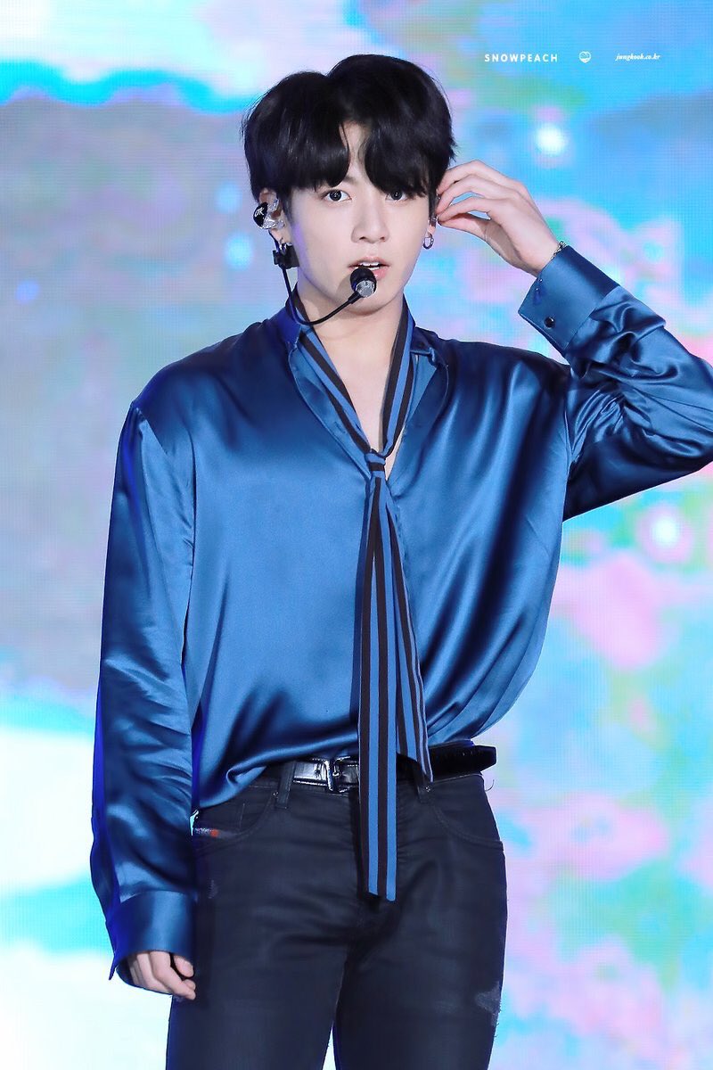 Material silk selalu berhasil menghadirkan imej seksi bagi yang menggunakannya. Jungkook BTS juga pernah menggunakan berbagai outfit berbahan silk yang memikat. Salah satu yang Cosmo pilih sebagai outfit silk terbaik dan terseksi Jungkook BTS adalah outfit berwarna biru di foto ini. Jungkook juga melengkapi gaya kemeja silk blue ini dengan celana hitam yang melekat sempurna di kakinya. Hasilnya? Begitu hot dan stand out, bukan?