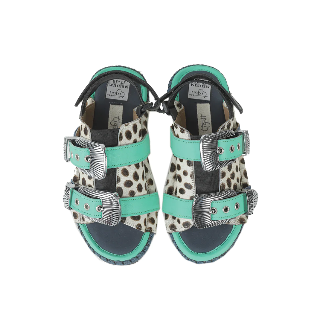 Tigah Home menghadirkan kreasi sporty sandal dalam kombinasi warna dan corak yang bold. Siapa sangka bila corak cheetah bisa berpadu apik dengan warna mint?! Desain buckles berukuran besar juga jadi statement lain dari sandal ini. Kamu bisa membelinya di situs Sonderlab.co seharga Rp1.090.000.