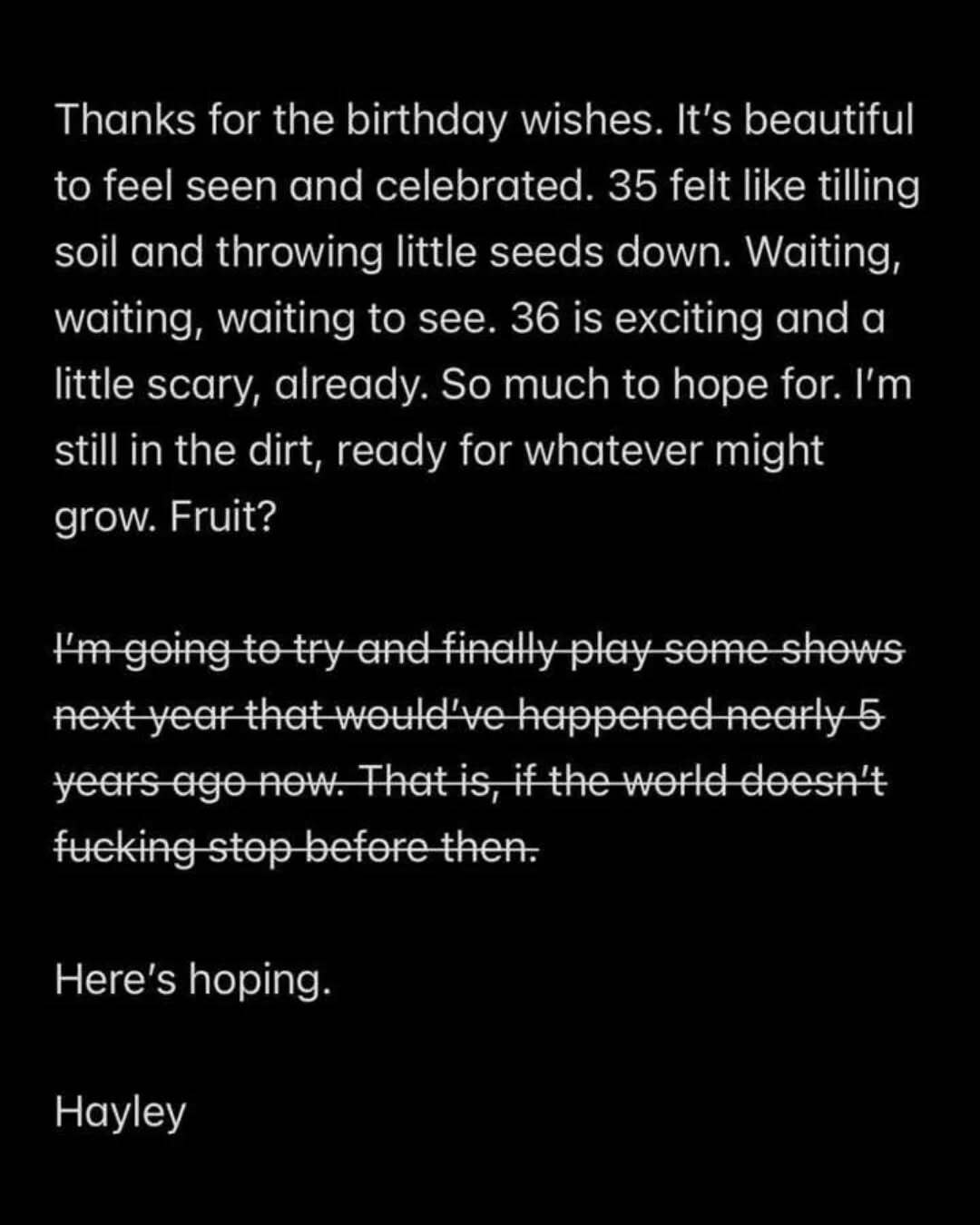 Kabar gembira tersebut ia bagikan tepat di hari ulang tahunnnya yaitu, 27 Desember 2024 lalu. “Saya akan mencoba dan akhirnya menjalankan beberapa pertunjukan yang seharusnya dilakukan sejak lima tahun lalu. Tapi, itu akan terjadi jika dunia tidak berakhir,” ujar vokalis Paramore tersebut melalui postingan Instagram Stories-nya. Pernyataan tersebut ia sampaikan bersamaan dengan ucapan terima kasih atas ucapan ulang tahunnya yang ke-36.