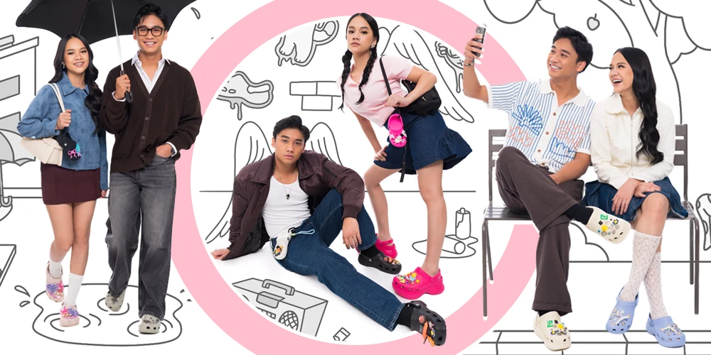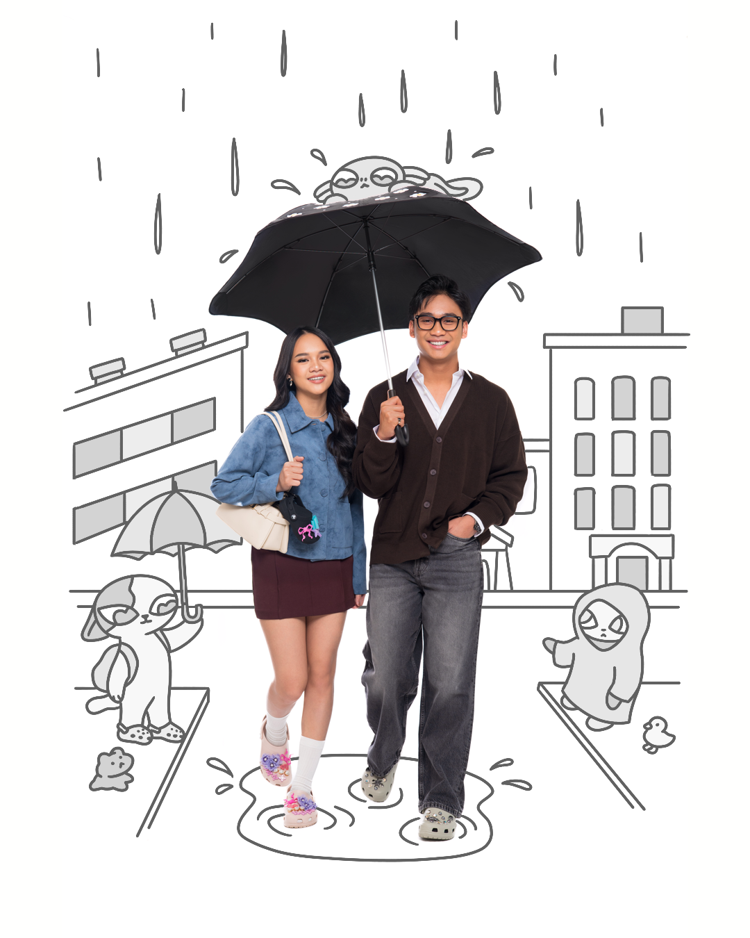 (Bevan Putera) Sweater, Noir Sur Blanc; kemeja dan celana, H&M; kacamata, Project Soul; cincin, FOUND OBJECT MARKET; sepatu, Crocs™. (Neona Ayu) Atasan, Array; rok mini, 3MONGKIS; anting dan kalung, FOUND OBJECT MARKET; tas, CHARLES & KEITH; sepatu dan bag charms, Crocs™. Payung, Wiggle Wiggle.