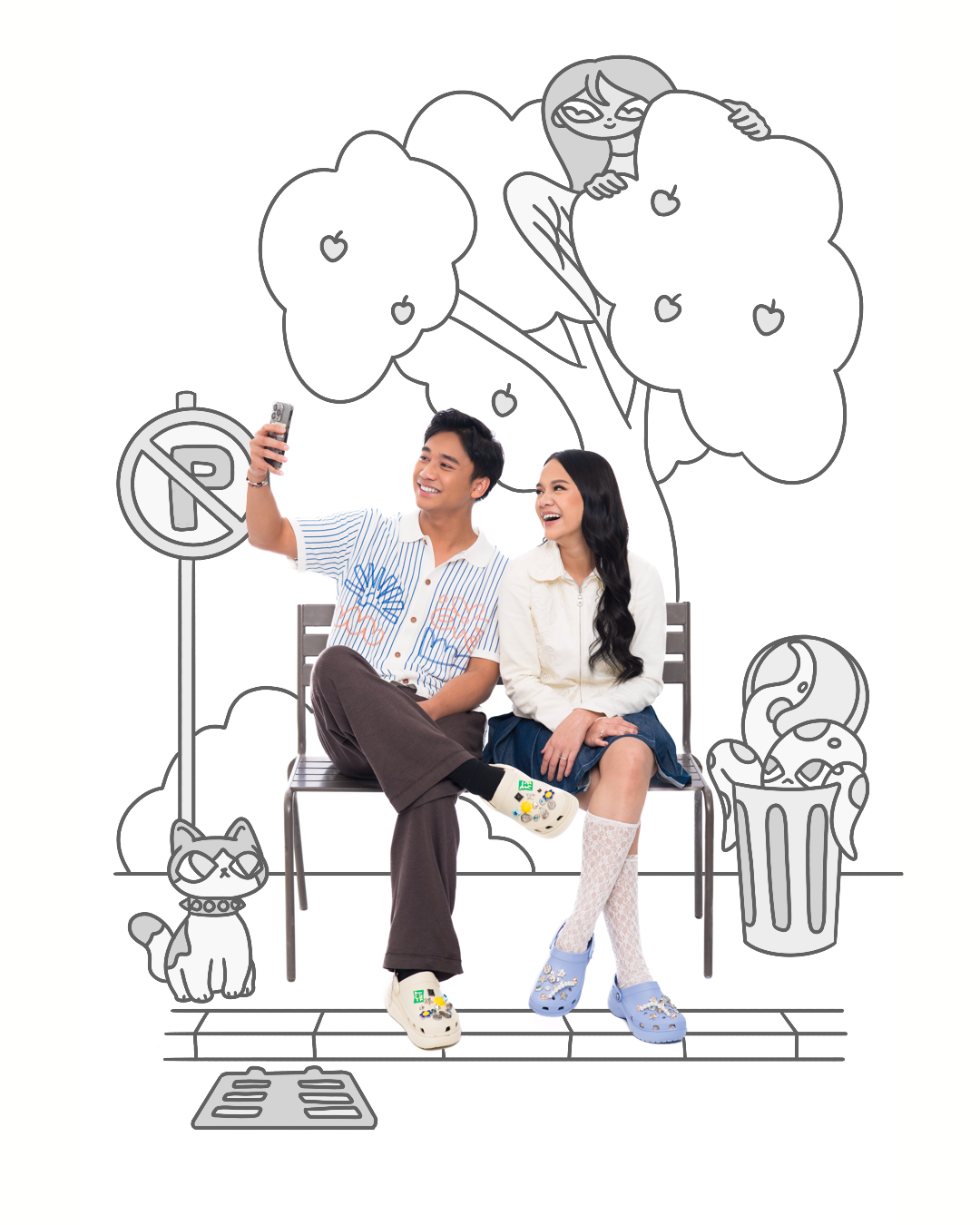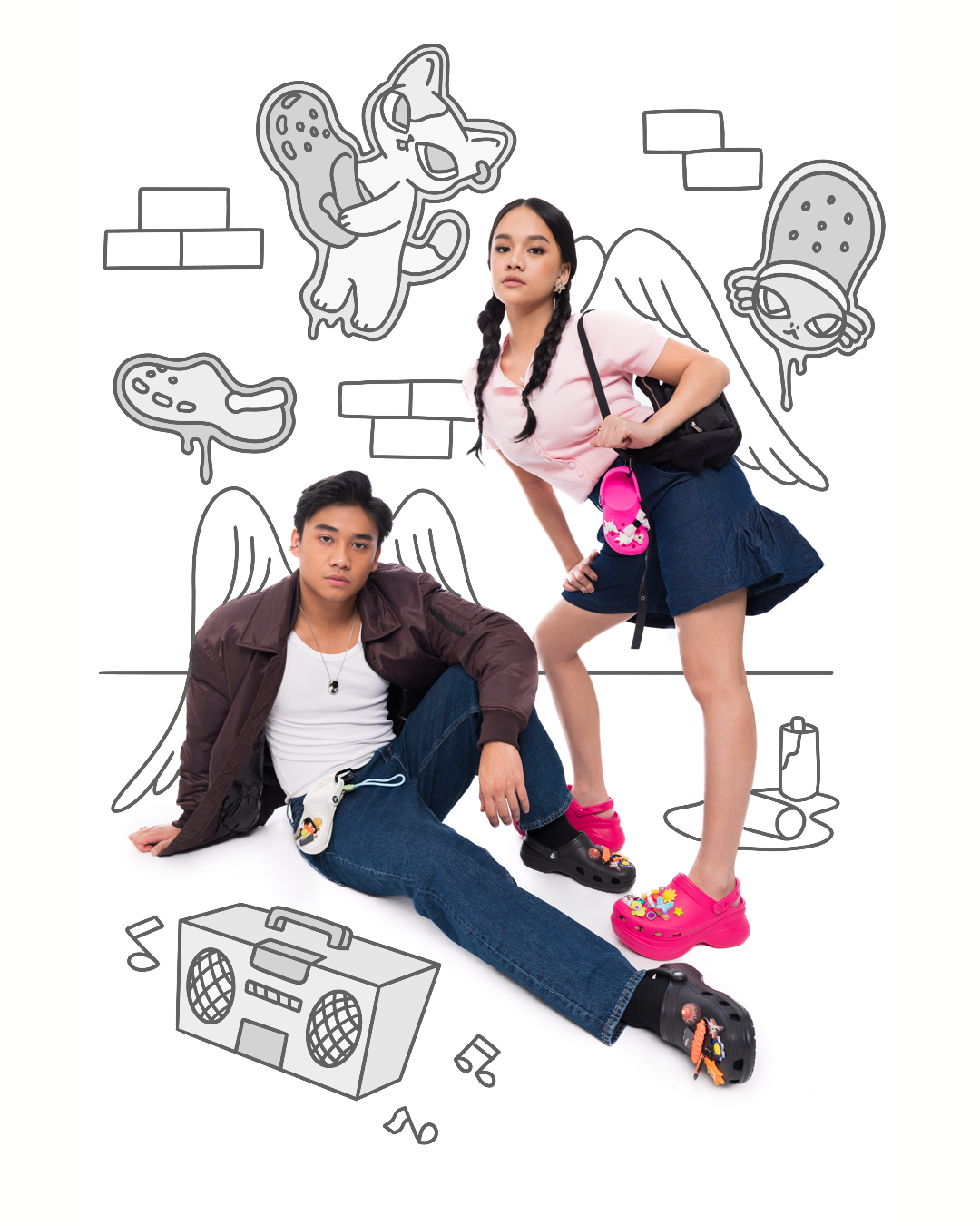 (Bevan Putera) Jaket dan ear cuff, milik stylist; atasan dan celana, H&M; kalung, ISSHU; sepatu dan bag charms, Crocs™. (Neona Ayu) Atasan, 3MONGKIS; celana, NAGITA SLAVINA; anting, ISSHU; tas, milik stylist; sepatu dan bag charms, Crocs™.