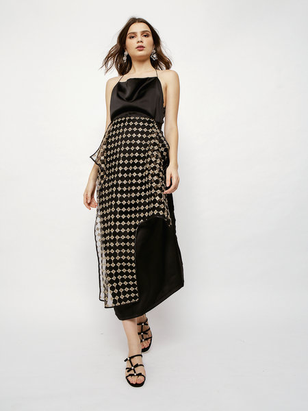LBD berbahan satin ini memiliki model yang tak biasa. Model leher halter pada bagian atas membuatnya terlihat elegan, dilengkapi detail kerut pada bagian samping. Yang membuatnya unik, terdapat satu buah lapisan yang menyerupai rok dengan detail embroidery. Sophisticated!