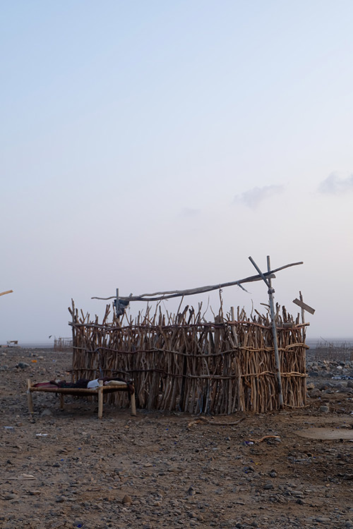 Sebelum bertolak ke Hamed Ela, sore itu kami menyaksikan matahari terbenam di salt flat. Pemandangan ini mengingatkan saya akan Salar de Uyuni di Bolivia, yang kerap saya lihat di timeline Instagram. Hamed Ela sendiri adalah sebuah desa kecil di kawasan Dallol. Seluruh rumahnya terbuat dari tumpukan batang kayu dengan terpal plastik dan karung sebagai atap. “Kita akan tidur di sini,” kata Ali dengan spontan sambil membuka pintu jip. Udara panas langsung bertiup menerpa wajah saya yang sudah dua hari tidak bertemu dengan air. Beberapa warga desa terlihat mengeluarkan tempat tidur dari anyaman yang mirip dengan bale-bale ke depan rumah. Karena suhu di Hamed Ela sangat panas, maka lebih baik setiap orang tidur di area terbuka.