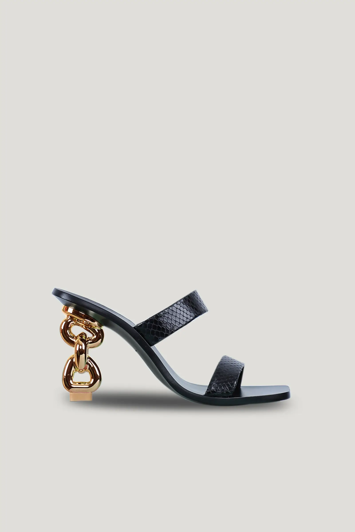 Selain model, untuk kamu juga bisa bereksplorasi dengan desain heels. Seperti pada sepatu Cult Gaia berikut. Desain heels yang berbentuk interlocking chain memberi nuansa glamor dan fierce secara bersamaan. Cocok bila dipadukan dengan jumpsuit atau gaun aksen slit.