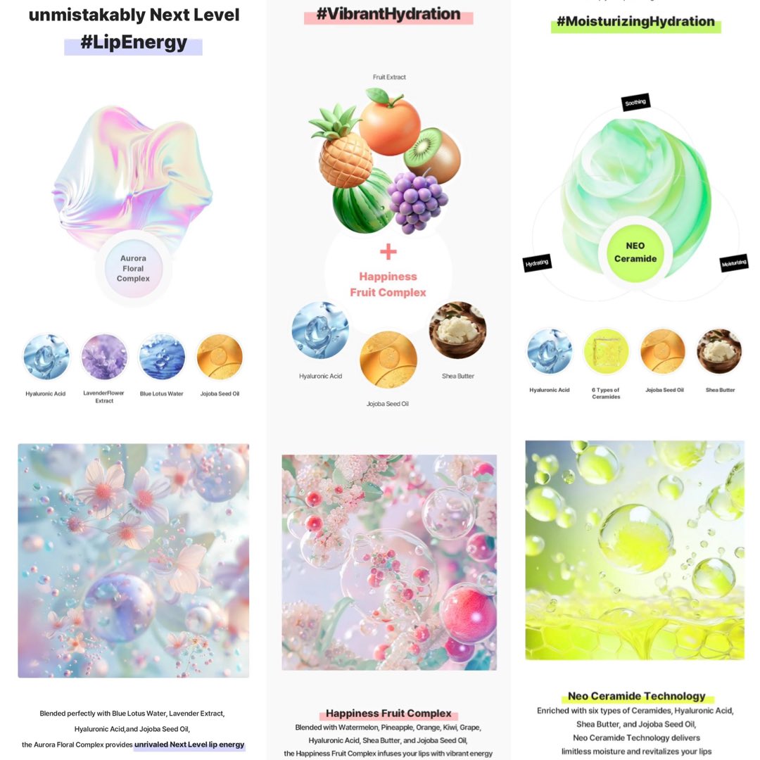 Ketiga varian lip balm tersebut mencerminkan ciri khas masing-masing grup. Untuk NCT, lipbalm didesain dengan warna hijau neon ikonik yang mencerminkan energi dan dinamika dari grup yang memiliki banyak sub-unit ini. Sementara itu, untuk Aespa, lip balm hadir dengan desain futuristik dan warna ungu holografik yang sejalan dengan konsep metaverse dan dunia virtual yang menjadi ciri khas mereka. Sedangkan untuk Red Velvet, desainnya mengusung warna merah elegan yang mencerminkan pesona dan keberagaman gaya musik grup tersebut.