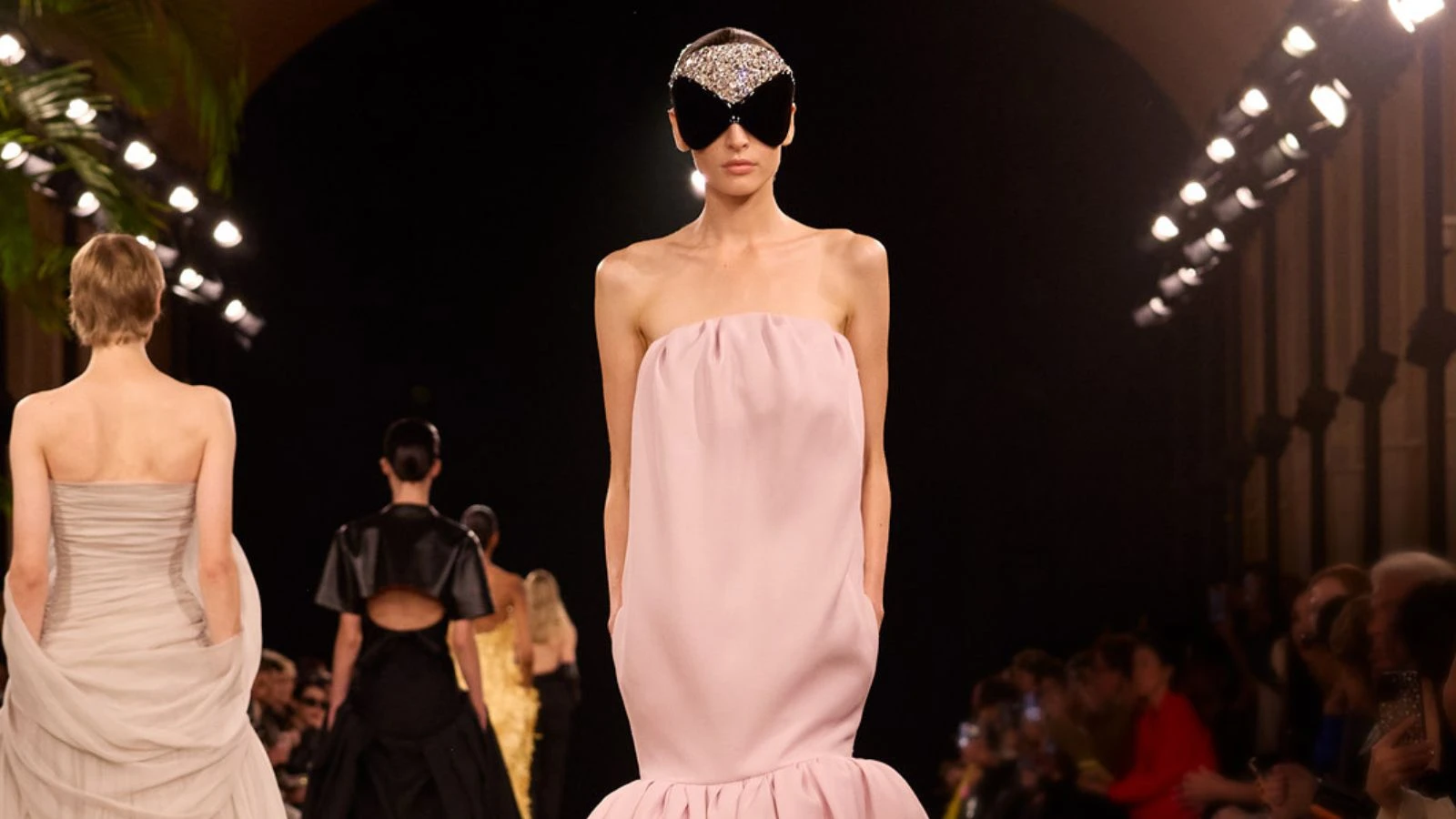 Selanjutnya tampil beberapa busana yang mengadopsi siluet haute couture Balenciaga. Seperti luaran model cape berbahan kulit, gaun aksen ruffles yang dibuat dengan potongan halter neck, serta gaun bersiluet mermaid blush pink yang menutup fashion show.