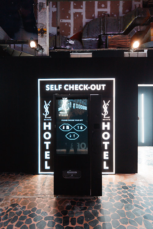 Ternyata perjalanan Cosmo belum berakhir, ladies! Setelah menjelajah seluruh ruangan YSL Beauty Hotel, Cosmo harus melakukan check out kembali di ruangan lobi hotel. Uniknya, proses check out dilakukan di sebuah mesin dengan menekan tombol menu yang berisikan pilihan tiga produk kecantikan dari YSL Beauty, yang nanti nya produk pilihan tersebut bisa Cosmo bawa pulang.