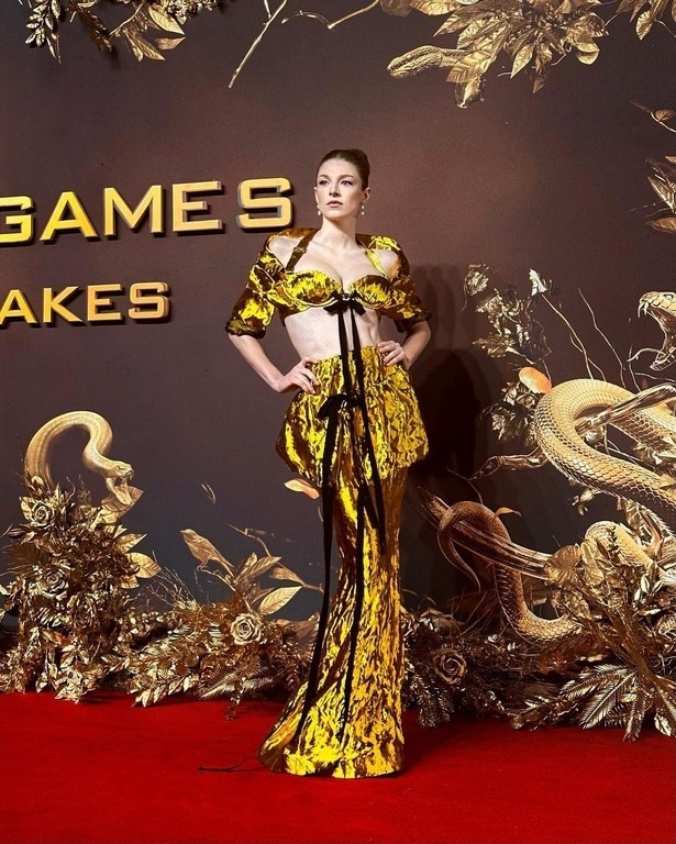Film trilogi "Hunger Games" identik dengan gaya berbusana yang nyentrik dalam nuansa yang whimsical. Hal tersebut juga terlihat betul pada penampilan Hunter Schafer berikut. Ia mengenakan gaun detail cut-out dan ruffles karya label Alexander McQueen. Sematan embellishments juga kian menampilkan nuansa dramatis.