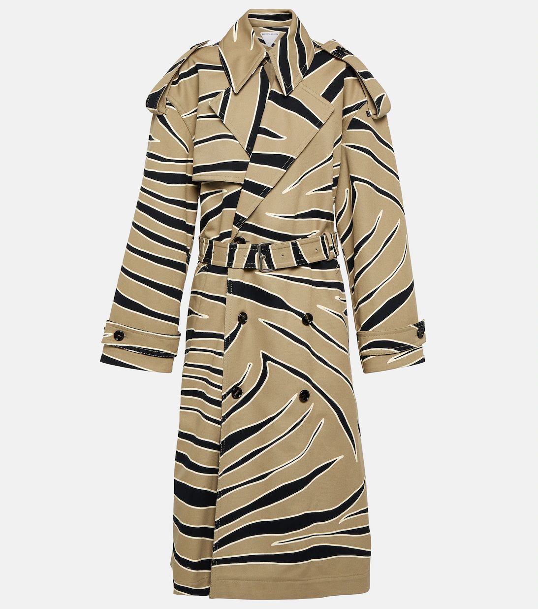 Trench coat identik dengan desain yang klasik lewat aksen kancing dan sabuk. Bottega Veneta menawarkan interpretasi yang lebih quirky lewat pulasan motif yang sekilas mengingatkan akan pola pada zebra.