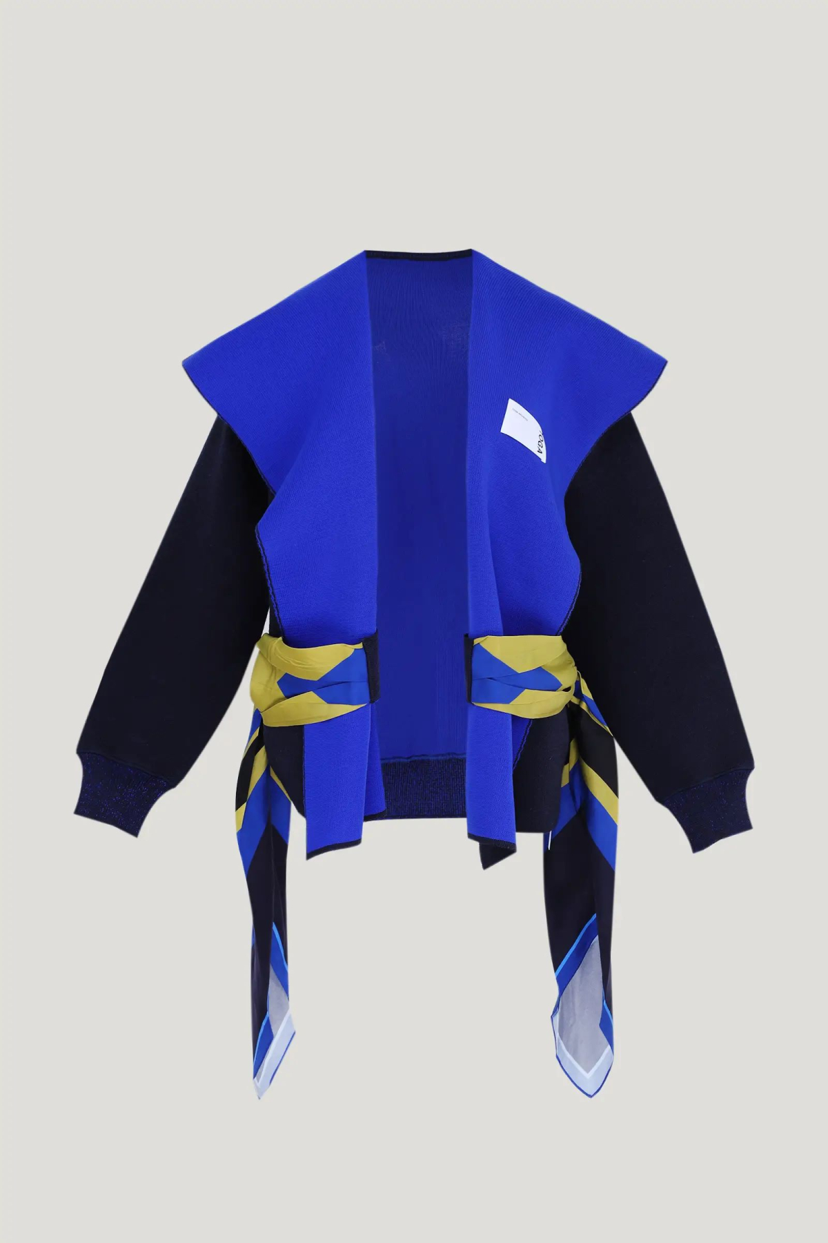 Label Toga menawarkan kardigan dalam versi yang lebih kontemporer lewat aksen kerah lebar dan scarf.