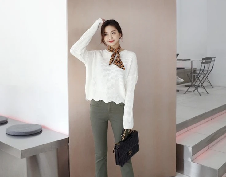 Sweater rajut dipadu dengan rok A-line memberi keseimbangan antara kasual dan profesional. Sepatu heels hitam yang ramping menambah kesan stylish, dan feminin yang cantik. Gaya ini cocok diaplikasikan di musim hujan atau musim dingin.