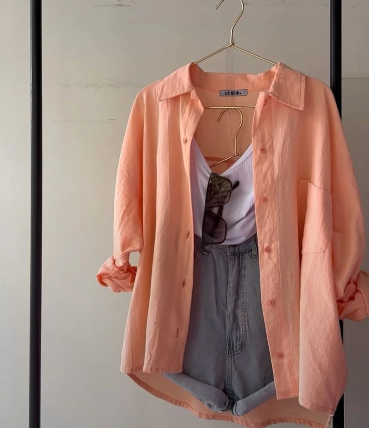 Mulai dari yang sederhana, yaitu outfit monokromatik. Kamu bisa memdukan atasan dan bawahan berwarna apricot senada, misalnya kemeja dengan celana palazzo. Lalu tambah tank top putih sebagai inner.