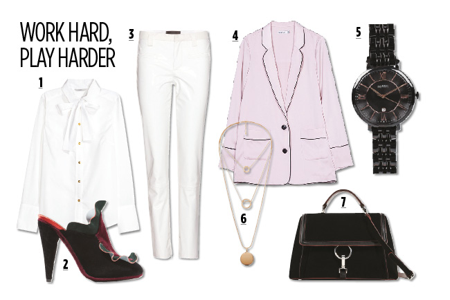 Usung gaya classy dengan menginjeksi nuansa minimalis pada blazer serta celana bahan patent leather. Terakhir, tuntaskan aksi lewat pilihan sepatu hak berdetail ruffles multi warna. Perfect!