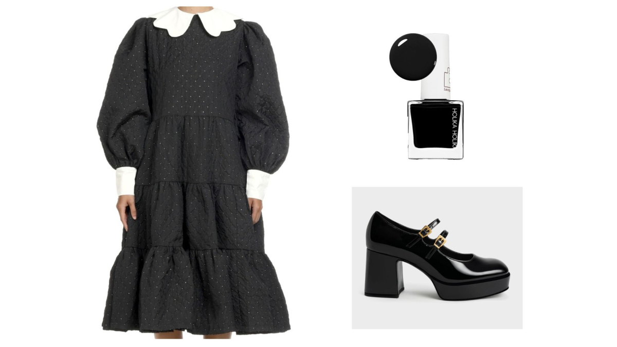 Tentu saja, ini merupakan tampilan Wednesday Addams yang ikonis. Di seri baru, gaun kerah klasik Peter Pan mendapat penyegaran dengan motif bunga polkadot. Dan sejujurnya, kamu bisa memakainya hampir sepanjang tahun. Kenakan sepatu tumit bertali atau dengan padukan leging dan sepatu bot tinggi selama musim dingin. Jangan lupakan juga gaya rambut kepang kuncir dan pulasan cat kuku warna gelap!