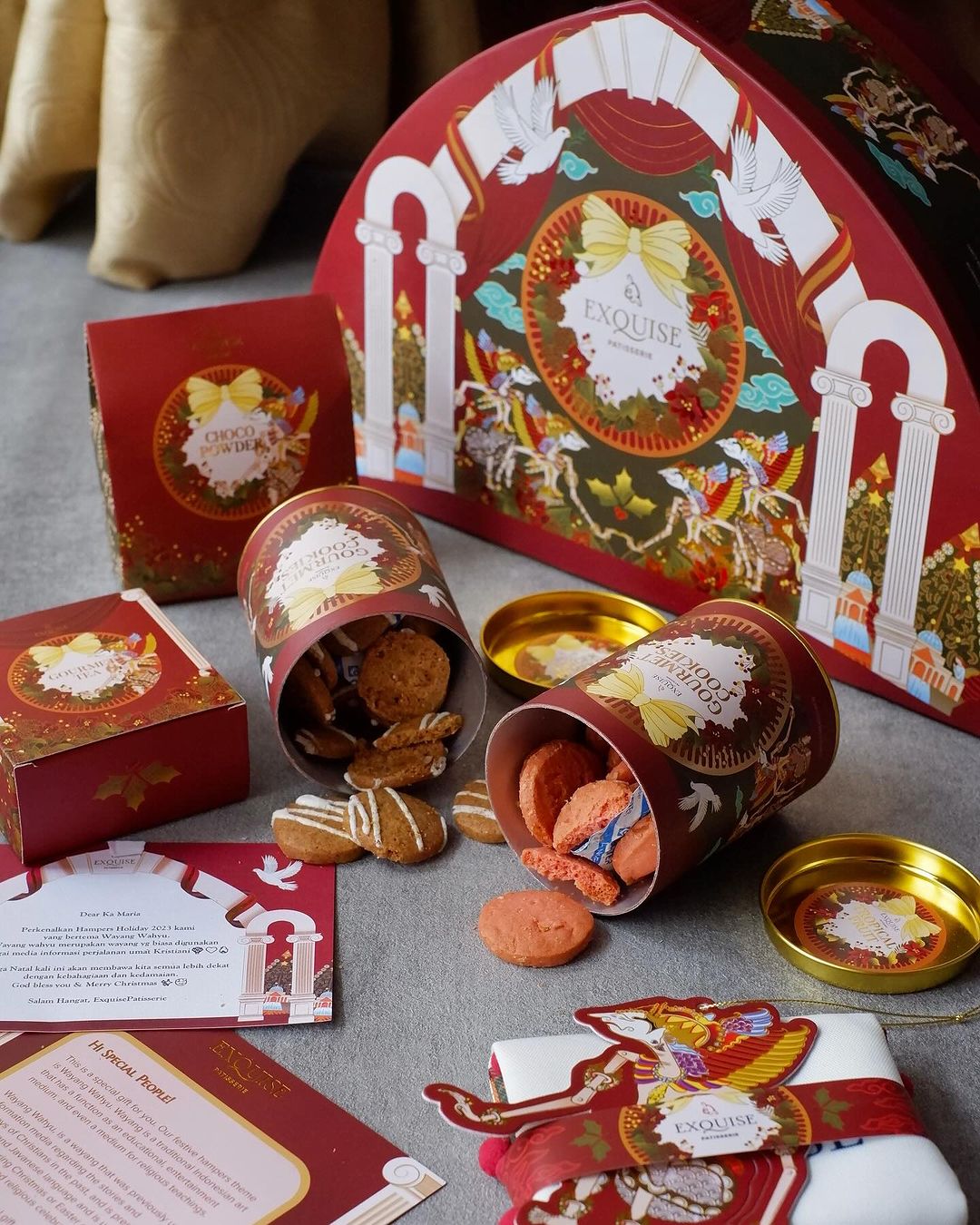 Exquise Patisserie menyediakan beragam hampers akhir tahun yang bisa menjadi pilihanmu, babes. Kamu bisa memilih paket yang sesuai dengan keinginanmu. Mulai dari paket yang berisi cookie hingga whole cake. Tersedia sembilan varian hampers yang bertema Wayang Wahyu. So, sudah tentukan pilihan hampers Exquise Patisserie-mu, babes?