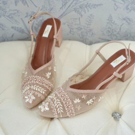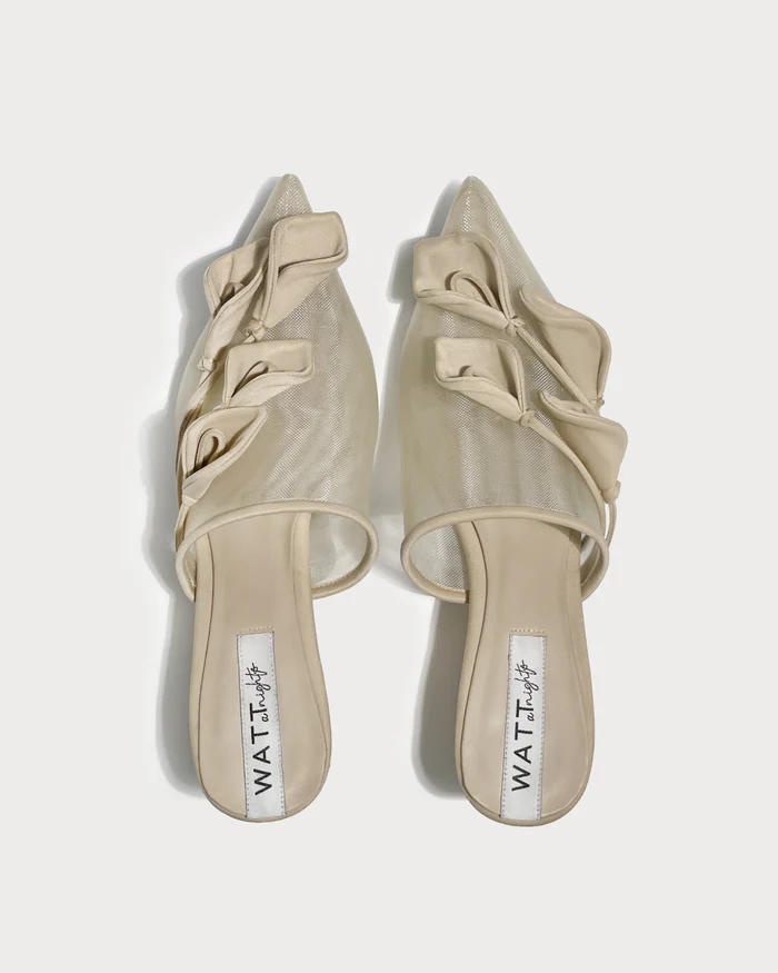 Callie Mules Nude dari WATT menampilkan bentuk mules dengan potongan terbuka di bagian belakang, dilengkapi material mesh bernuansa nude. Pilihan warna ini menciptakan ilusi kaki yang lebih panjang sekaligus memudahkan padu padan busana lintas warna dan gaya busana.