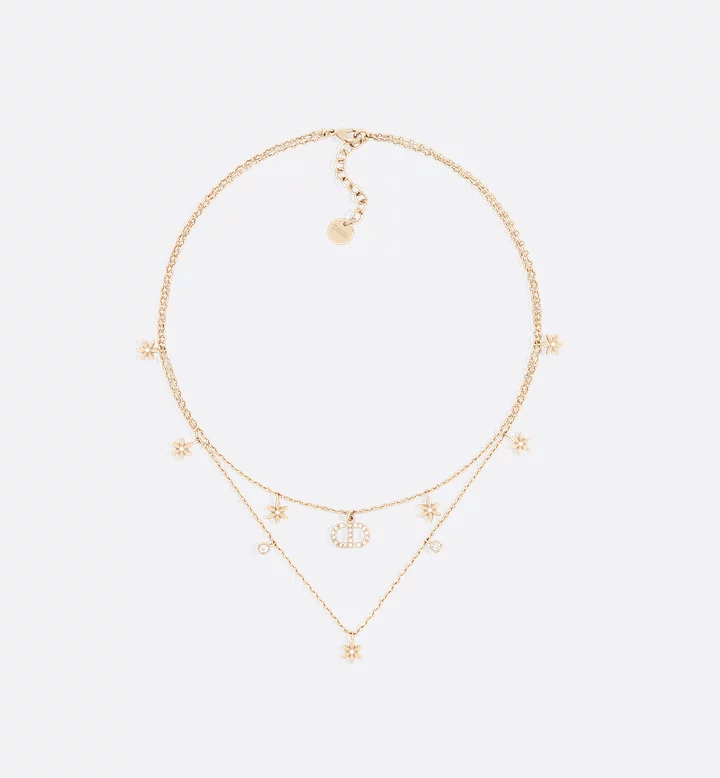 Kalung Dior ini hadir dengan desain layered necklace yang memadukan material berwarna emas dengan elemen dekoratif yang detail. Bagian utama perhiasan ini menampilkan liontin logo "CD" yang dilapisi deretan kristal, didampingi oleh aksen berbentuk bintang dan butiran mutiara yang tersebar di sepanjang rantai bertingkat. Struktur dua lapis ini memberikan dimensi visual yang mengisi area leher secara proporsional.
