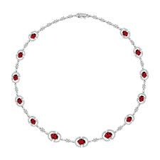 Kalung dari Mondial ini menampilkan desain station necklace dengan warna kontras yang memadukan material berwarna perak dan batu permata merah berbentuk oval. Struktur perhiasan ini terdiri dari rangkaian motif berbentuk mata yang saling terhubung, di mana setiap motif membingkai satu batu permata merah di bagian tengahnya. Tampilan warna merah yang dominan pada kalung ini selaras dengan simbol warna perayaan Tahun Baru dan Valentine, menjadikannya opsi hadiah yang romantis dan cantik.