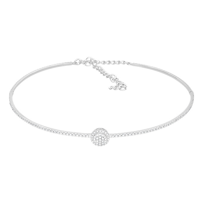 Passion Jewelry menghadirkan desain choker minimalis dengan struktur kaku yang melingkar mengikuti bentuk leher. Perhiasan ini terbuat dari material berwarna perak yang pada bagian depannya dipenuhi dengan deretan berlian atau kristal kecil yang tersusun rapi hingga ke titik pusat. Bagian tengah kalung menampilkan sebuah liontin berbentuk lingkaran yang juga bertaburkan berlian. Kehadiran rantai tambahan di bagian belakang memberikan kebebasan untuk menyesuaikan tingkat kekencangan kalung sesuai dengan ukuran leher pemakainya.