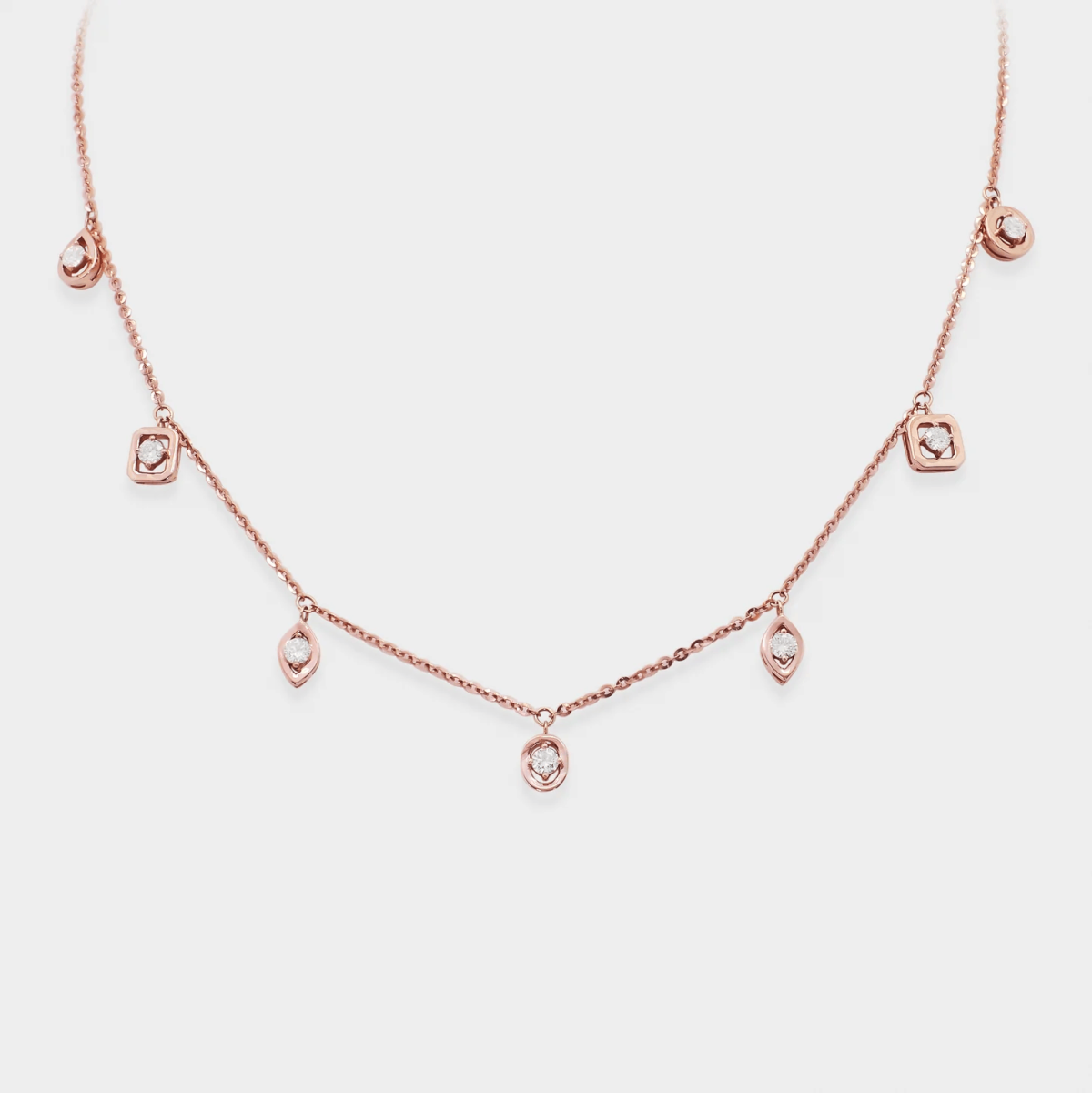 Kalung dari Wanda House of Jewels ini hadir dengan desain station necklace yang menggunakan material rose gold yang memberikan kesan hangat. Perhiasan ini memiliki detail gantungan yang tersebar secara asimetris di sepanjang rantai halus, terdiri dari berbagai bentuk geometris seperti lingkaran, persegi, dan siluet menyerupai kelopak bunga atau tetesan air. Setiap elemen gantungan tersebut membingkai sebuah berlian kecil di bagian tengahnya, menciptakan kilau yang merata di sekeliling leher.