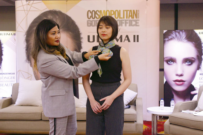 Setelah sesi makeup class yang menyenangkan, fashion editor Dheniel Algamar dan fashion stylist Yoanita Tahalele memberikan tips profesional untuk tampil stylish di tempat kerja, termasuk cara mengikat scarf untuk gaya yang lebih chic.